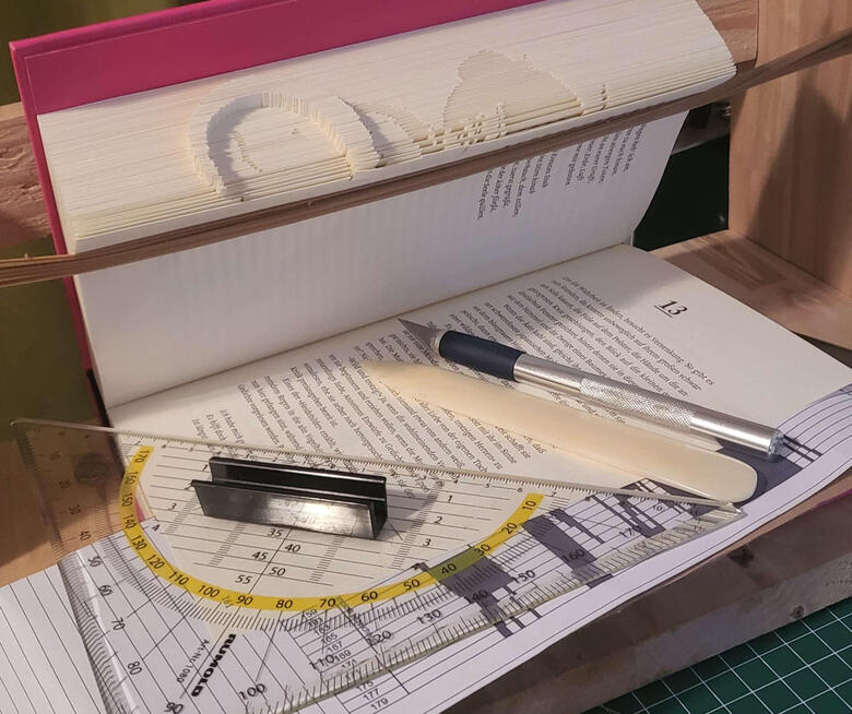 Ich bin auch gerne kreativ. Bastel viel und nähe auch. Außerdem falte ich Bücher. Ich bringe Motive in ein Buch.